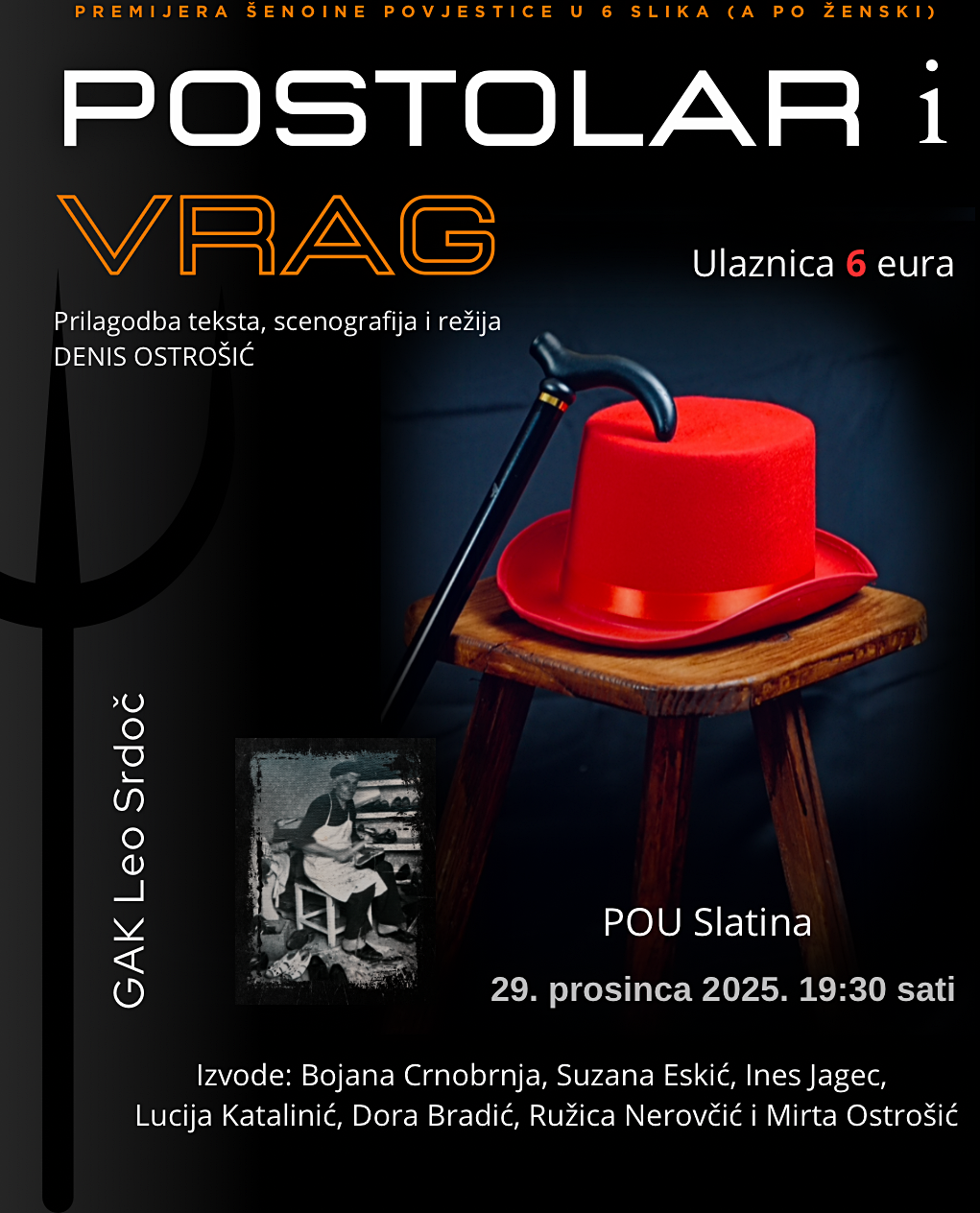 Gradsko amatersko kazalište „Leo Srdoč“ proteklih je mjeseci intenzivno radilo na novoj predstavi, pretvarajući Šenoinu epsku pjesmu iz „Povjestica“ Postolar i vrag u osvježenu, duhovitu i na ženski način ispričanu kazališnu priču kroz šest živopisnih slika. Proces rada obilježili su kreativnost i entuzijazam glumačke postave, čija energija sada stiže pred publiku.
